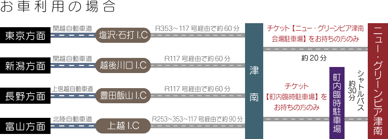 • 「チケット【ニュー・グリーンピア津南会場駐車場】」をお持ちのかたは、直接ニュー・グリーンピア津南会場へ向かってください。
