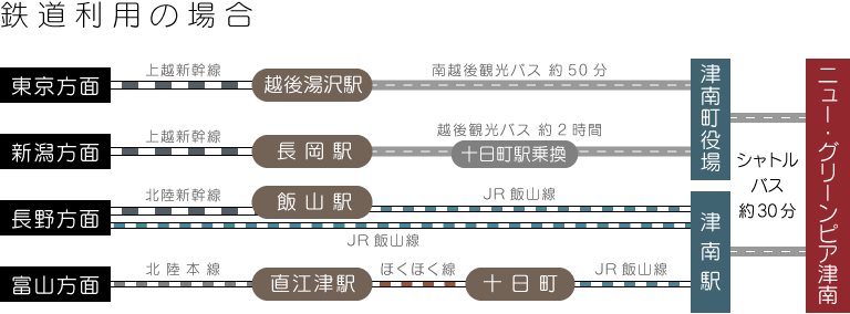 • 津南駅から、または津南町役場前から、シャトルバスによりニュー・グリーンピア津南会場へ向かってください。